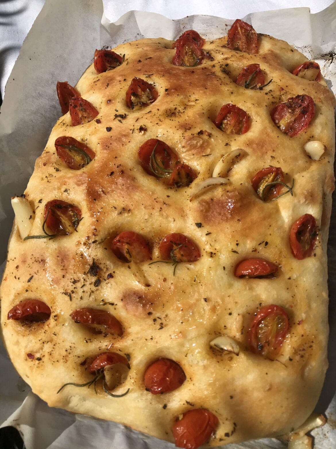 Deflate the dough and transfer it to a previously oiled rectangular tray and leave the dough almost in the same shape as the tray. Let it rest for an hour, give it the distinctive shape of focaccia.
