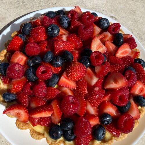 Spread the filling on top of the crust and decorate with fruits such as strawberries, blueberries, etc.